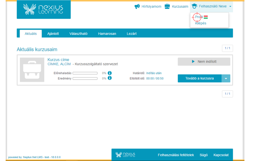 A jelszó megváltoztatására a tanulói profilban van lehetőség. Ehhez a jobb felső sarokban a felhasználó nevére, majd a