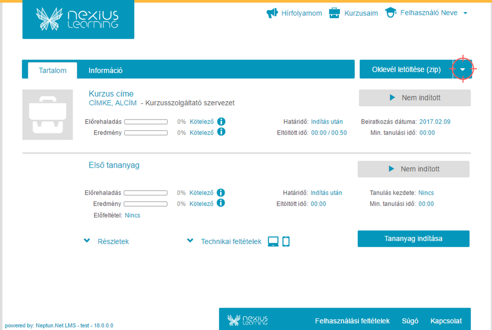 A kurzusba belépve, a "Tartalom" és az "Információ" fül mellett, a jobb felső sarokban található "Oklevél letöltése (zip) " felirat melletti kis nyílra kell kattintania.