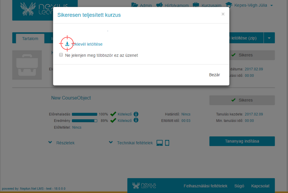 - Kattintson az "Oklevél letöltése (pdf)" feliratra. A letöltött oklevelet megnyitva kinyomtathatja, vagy e-mailben csatolva továbbküldheti a tanusítványt.