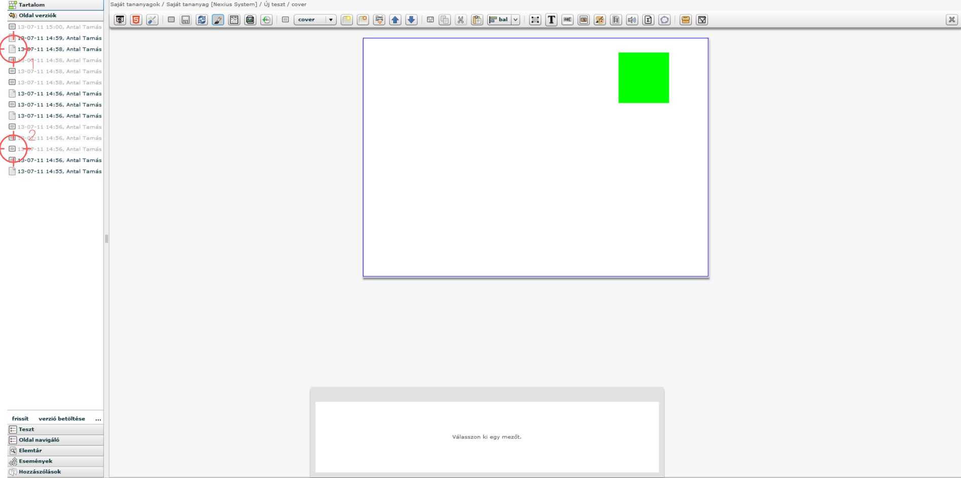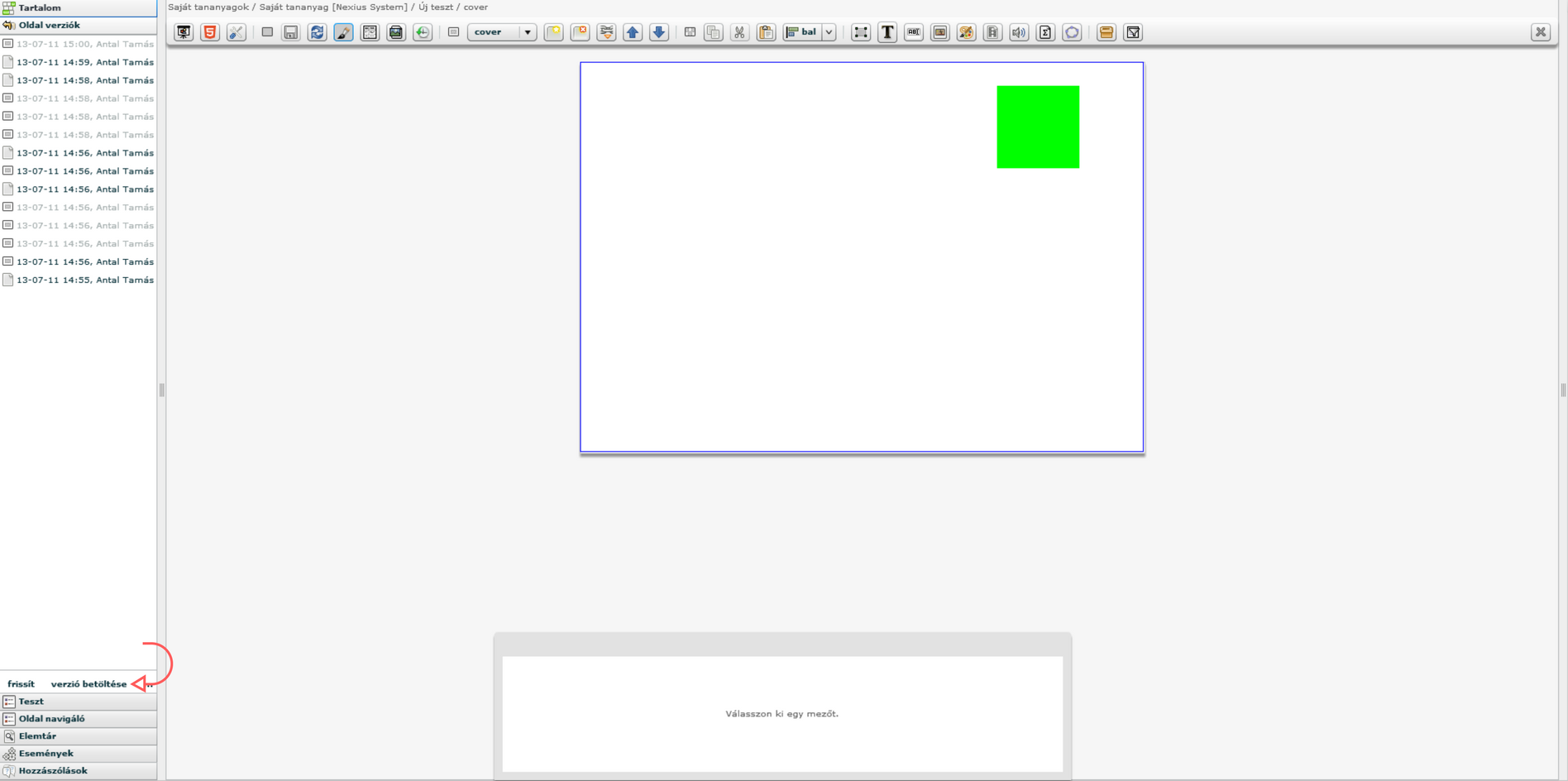 Ekkor a szerkesztőben megjelenik az adott időponthoz elmentett oldalállapot: az oldal összes szakasza, és azon az összes objektum az adott időpillanatnak megfelelő állapotban töltődik be. Ha az oldalon abban az időpontban több vagy más szakaszok szerepeltek, vagy az oldalon akkor még szerepelt azóta törölt teszt, akkor ezek a korábbi állapotnak megfelelően fognak megjelenni. A metaadatok (például az oldalhoz tartozó szószedet) és az oldalon található tesztfeladatok nem verziókezelődnek, így ezeket visszaállítás után is a legfrissebb állapotukban látod.