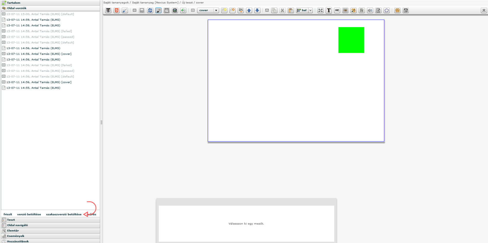 Egy szakaszverzió kiválasztása után a Szakaszverzió betöltése / load item version gomb hatására csak az éppen szerkesztett szakasz állítódik vissza a megjelölt állapotba. Az oldal tulajdonságai ( a szakaszok és a tesztek), valamint a további szakaszok a betöltés előtti állapotban maradnak (míg ha ugyanezt a szakaszt kiválasztva a verzió betöltése gombra nyomsz, akkor az oldal minden eleme az adott szakaszmentés időpontjának megfelelő állapotra fog ugrani).