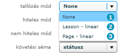 browse mode,for credit,non credit beiratkozás esetén.A tananyagok alapértelmezetten mindhárom tanulási környezetben szabadon bejárhatók. Ha azt szeretnénk, hogy a tananyag lecke vagy oldal szinten lineáris bejárású legyen, akkor a legördülő menüből a None értéket állítsuk át Lesson - linear vagy Page - linear helyzetűre, attól függően, melyik módban milyen bejárást szeretnénk lehetővé tenni.