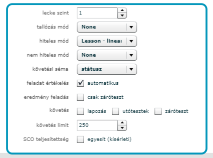A struktúrapanelben található Tananyagbeállítások / content configuration menüben az alábbi beállítások a publikálás folyamata során olvasódnak be, és a publikált (vagy exportált) tananyag SCORM szabványos működésére, a tanulásra és a tanulási eredmények rögzítésére vannak hatással. Jellemzően tananyagszintűek, vagyis a publikációk között nem változnak.