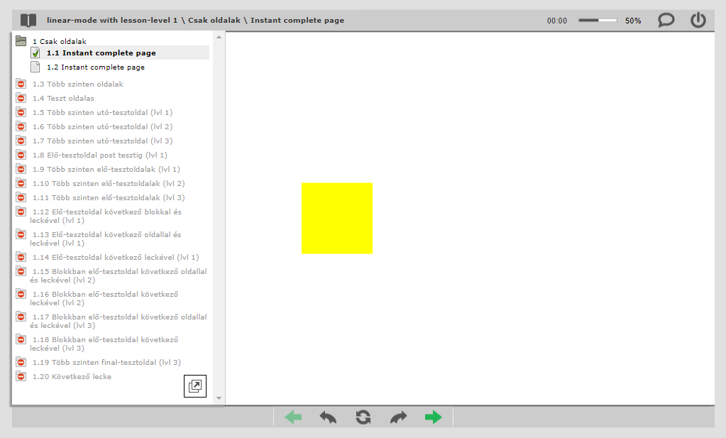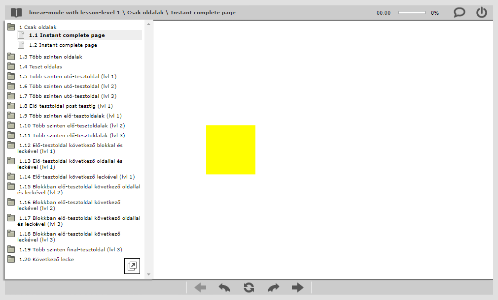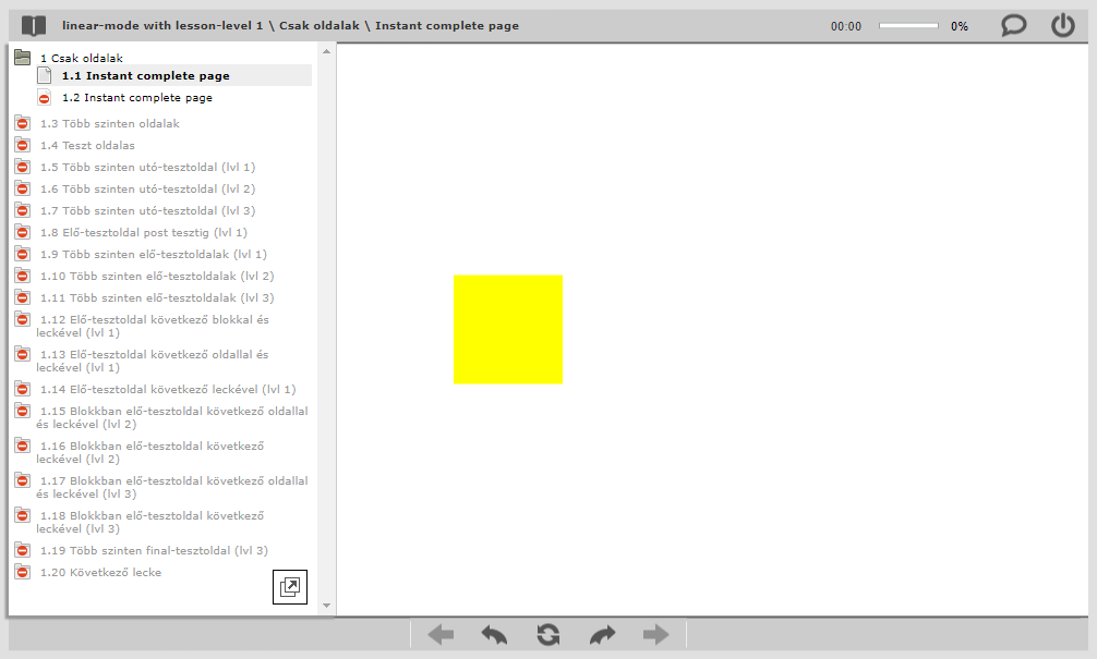 Ha ez a mód van beállítva, csak abban a sorrendben haladhat a tanuló, ahogy az oldalak a leckéken belül követik egymást. Akkor léphetünk tovább a következő oldalra, ha az adott oldal teljesítetté vált. Ha egy lecke minden oldala teljesítetté vált, akkor léphetünk tovább a következő lecke első oldalára. Ebben az esetben a tanuló sem a tartalomjegyzék, sem a tanulói felület láblécében található nyilakkal nem tud a nem teljesített oldalak között navigálni. A teljesített oldalak között viszont szabadon navigálhat.