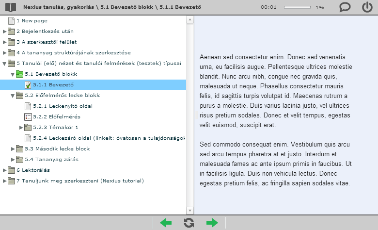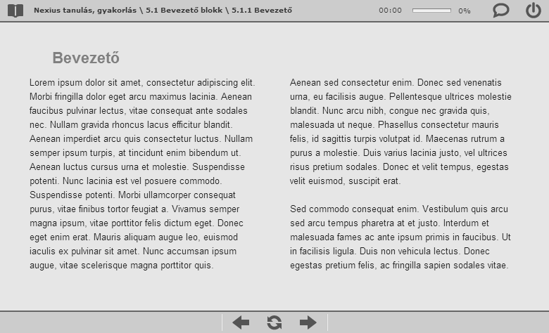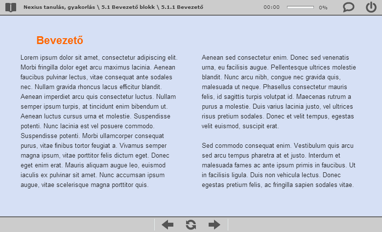 Alul találod a navigációhoz szükséges gombokat, amelyekkel előre, vissza (next, previous): Előre-, illetve visszalapozhatsz a tananyagban. Frissítés (Reload): Szükséges lehet a bonyolultabb oldalak újraolvasása. Ezzel a gombbal a tanuló egy kattintással újratöltheti az oldalt.