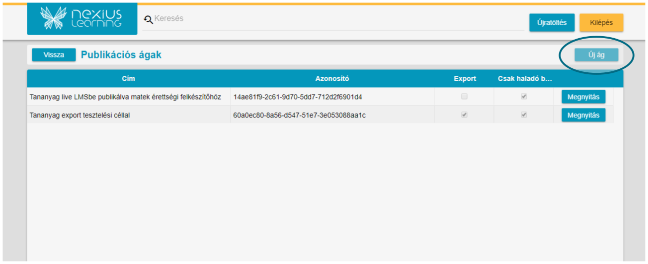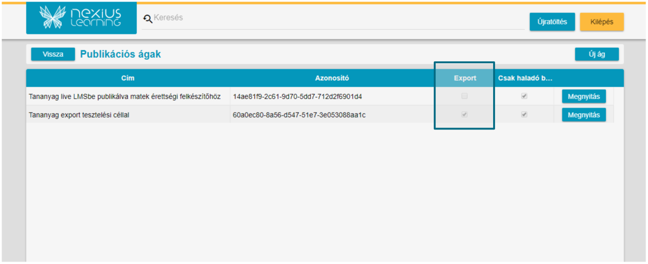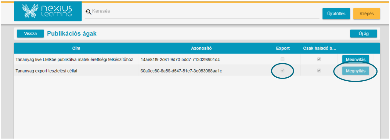 A publikációs ágak listázófelületéről a Megnyitás / Open gombbal nyisd meg az export ágat, amelyből exportálni szeretnél.