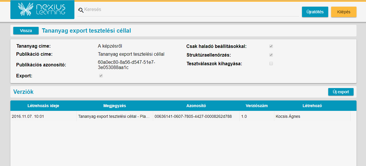 A Mentés / Save gomb megnyomása után létrejön a példány, és a megadott beállításokkal megjelenik a verziólistázó felületen, de a letölthető tananyagcsomag generálása időt vesz igénybe. Ez egy aszinkron művelet, a rendszer akkor hajtja végre, ha a megelőző publikációk elkészültek.