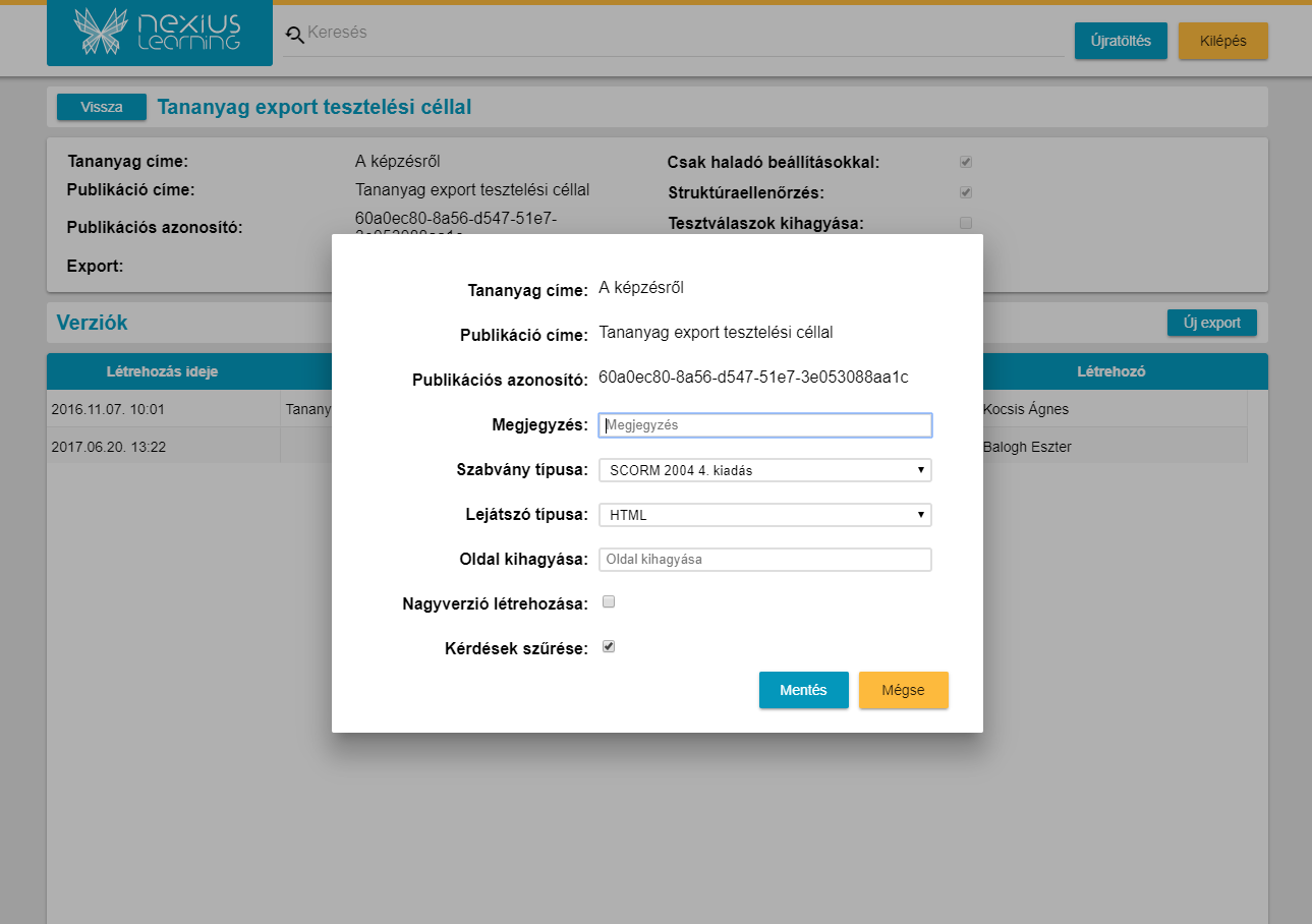 Más oktatásszervező rendszerbe történő exportálás esetén a befogadó környezet által elvárt SCORM szabványt, offline vagy nem szabványos környezet esetén a Nincs / None opciót kell kiválasztani.