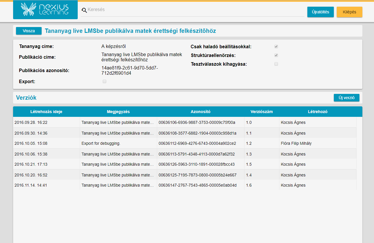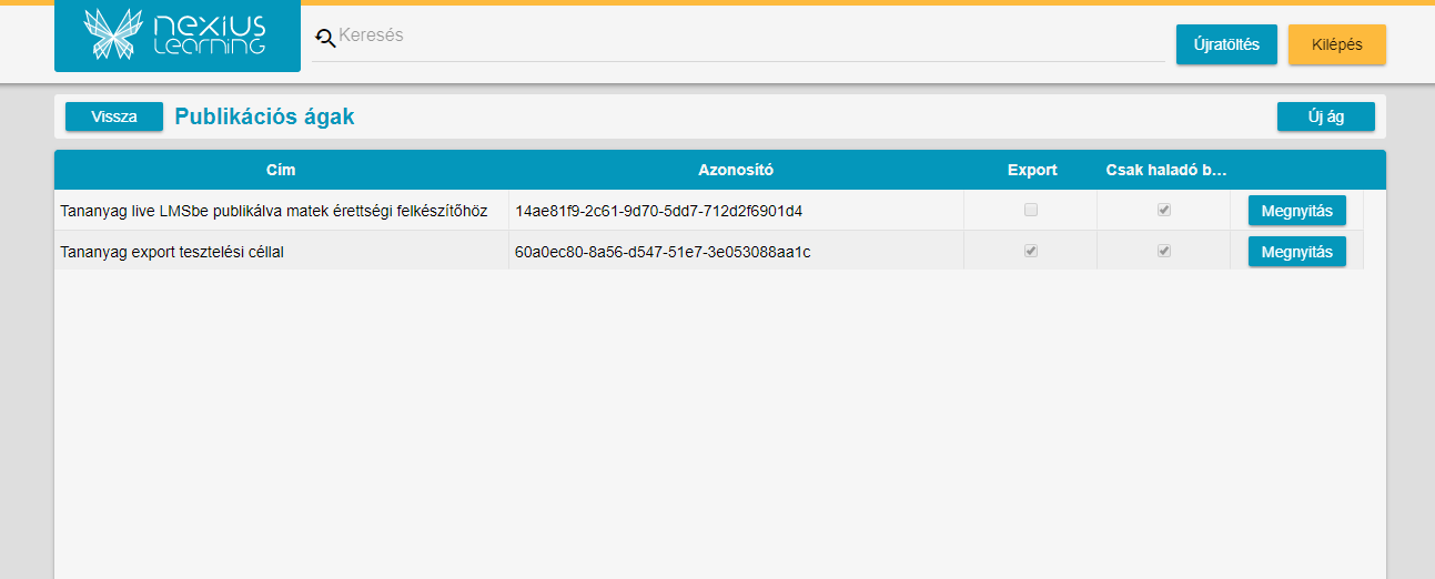 A gombra kattintva megjelenik a tananyag publikációs ágainak listája az ágak címével és azonosítójával. Az egyes ágak mellett fel van tüntetve, hogy export ágról van-e szó, illetve hogy az adott ágban új verzió létrehozására csak superuser, vagy adminisztrátor is jogosult.