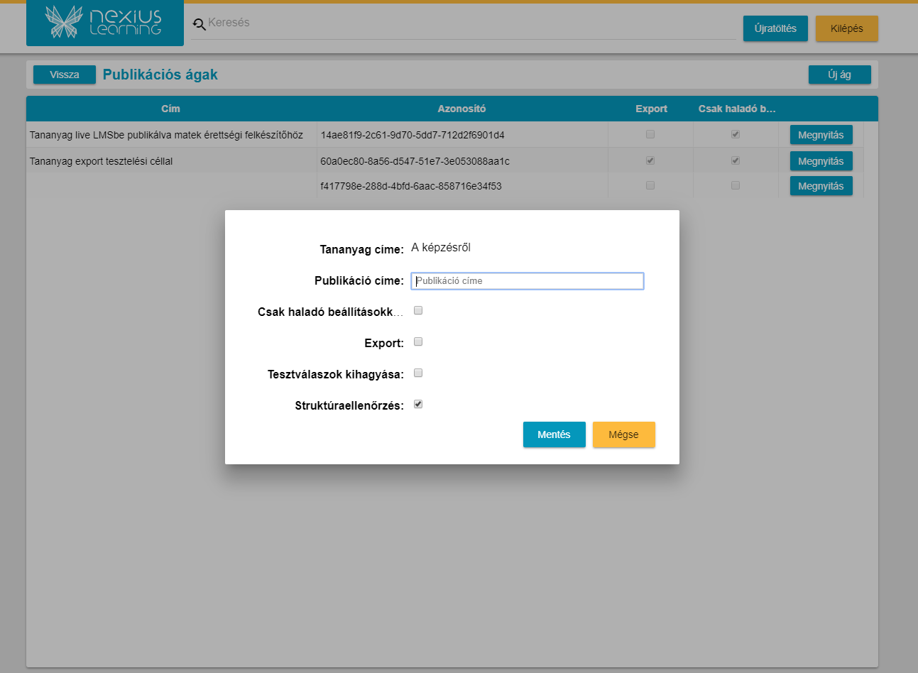Szerkesztő / Editor jogosultságú felhasználó meg tudja nyitni a tananyag publikációs ágainak és verzióinak listáját, de új ágat vagy verziót létrehozni nem tud. Szerkesztőnél alacsonyabb jogosultságú felhasználónak a lista megtekintésére sincs jogosultsága, számára a tananyaglistázó felületen a Publikálás gomb helyett csak egy lakat jelenik meg.Publikációs ágat csak superuser jogosultságú felhasználó hozhat létre, adminisztrátor felhasználónál nem látható az Új ág / Create publish branch gomb a felületen.
