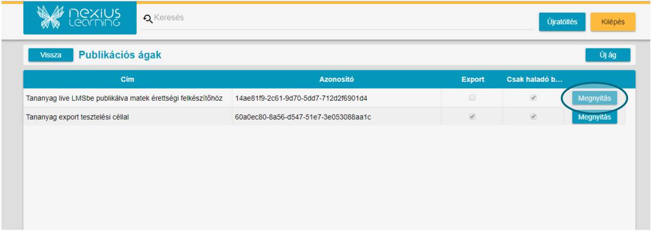 A publikációs ágak listázófelületéről a Megnyitás / Open gombbal nyisd meg a publikációs ágat, amelyben új verziót szeretnél létrehozni.