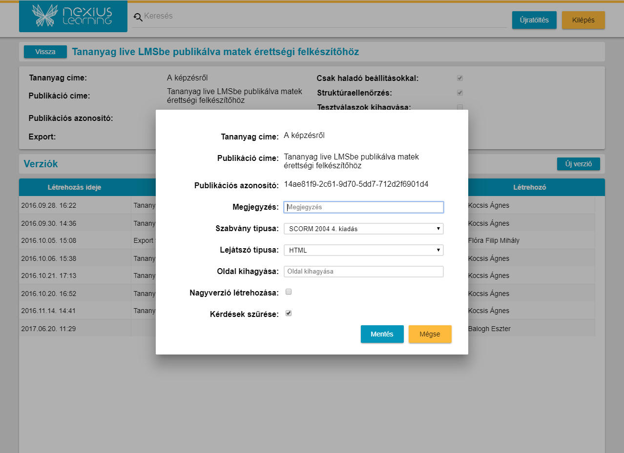 Publikálás előtt győződj meg róla, hogy nincs már teendő az anyaggal, senki nem dolgozik már rajta, és SCORM kompatibilis a struktúra (nincs például blokkon kívüli oldal). Ellenőrizd a tananyaglejátszó felületet és a tananyag SCORM szabványos működését érintő beállításokat a Tananyagbeállításokban, valamint a kategóriát és a nyelvbeállítást a Content Meta Editorban.