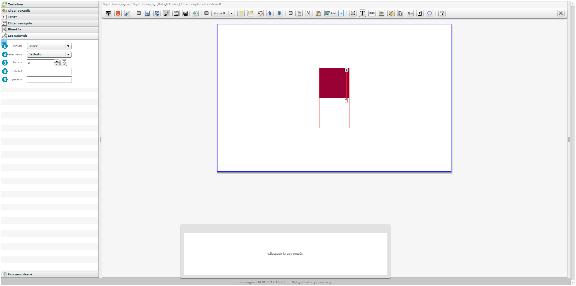 Tesztfeladat szakaszokon a kiértékel, evaluate esemény ellenőrzi a feladatot, és ha a válasz helyes elsüti helyes / correct kioldót.