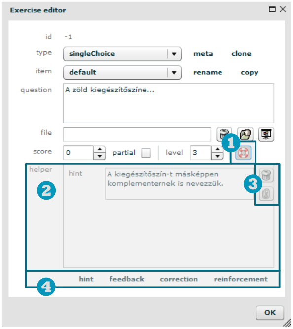 Lehetőségünk van a feladatokhoz csatolni különböző típusú bizonyos súgókat, segítségeket (helpereket).