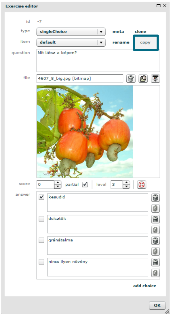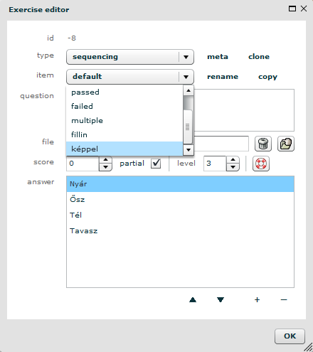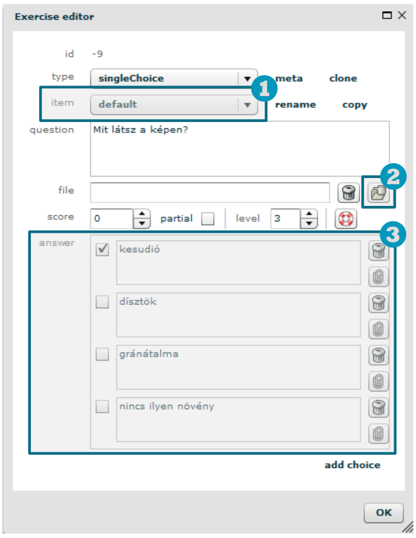 A feladatok szerkesztésekor, amikor képes feladat következik, válaszd a képpel sablont, majd a File mező mellett kattints az upload gombra, és töltsd fel a kívánt képfájlt.