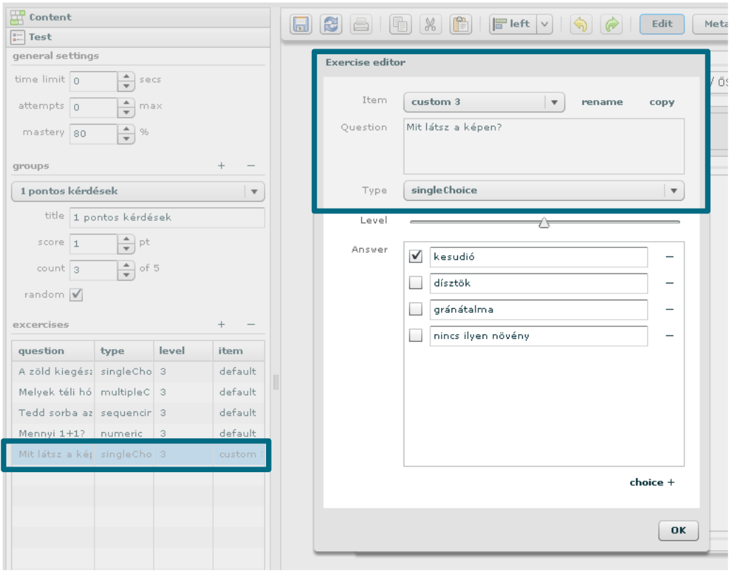 Az új szakasz a „custom 3” nevet kapta. Figyeld meg, hogy megváltozott a kérdés melletti item neve itt és a feladatszerkesztő ablakban is: