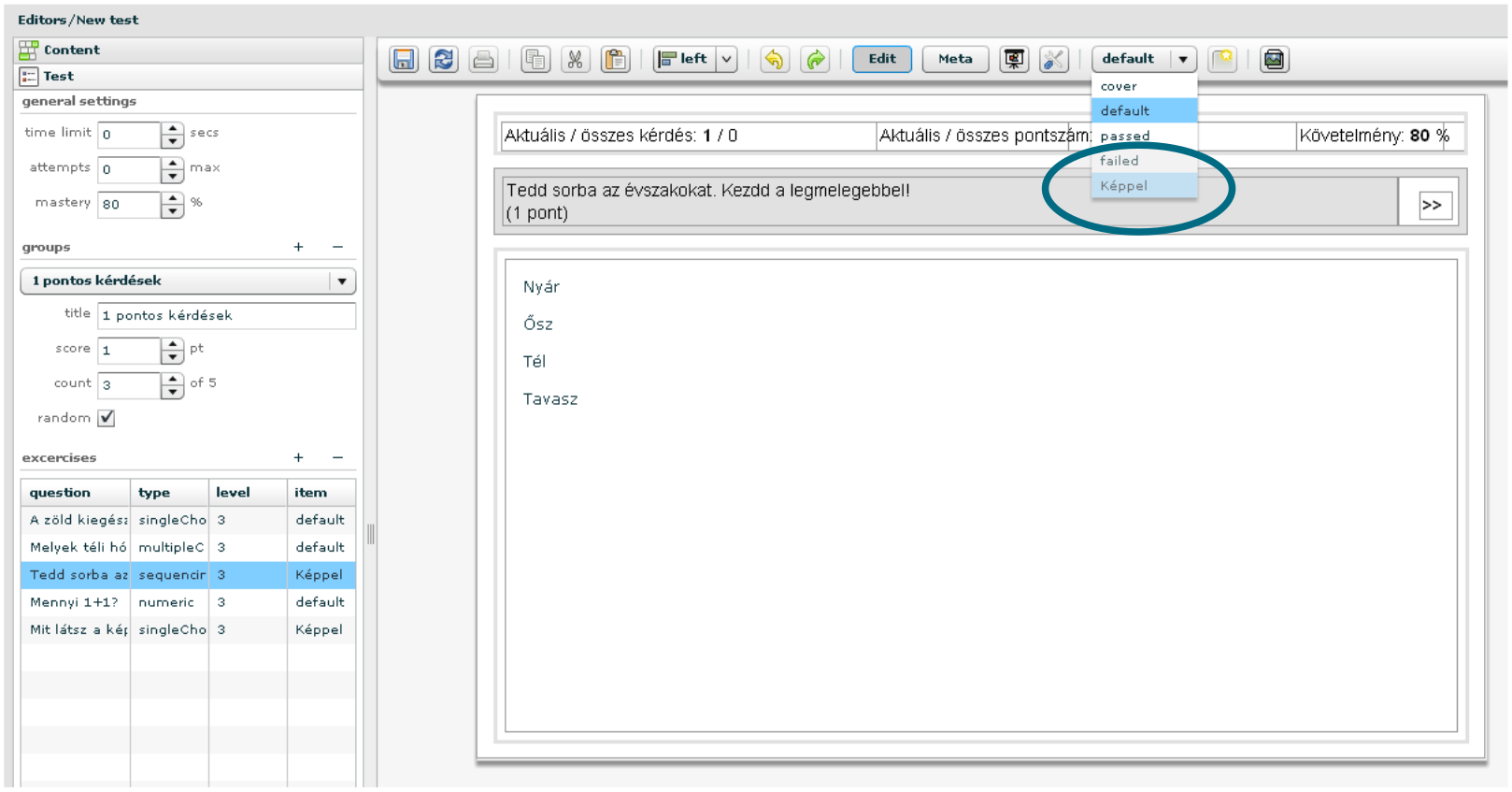 default sablon, a másikhoz viszont nem (pl.: kép tartozik hozzá).Hozz létre egy új oldalsablont, a default sablon másolásával. Ehhez először meg kell nyitnod egy feladatot (kattints rá duplán a Test fülön vagy válaszd ki, majd kattints az open gombra).