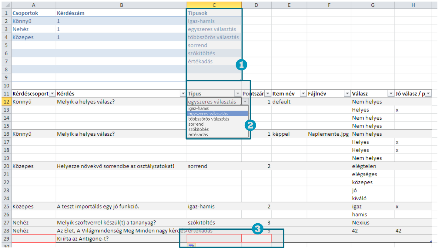 Az importálás lényege, hogy egy megfelelő formátumú Excel xlsx fájlba felvisszük a kérdéseket és a válaszokat, majd egyszerűen betöltjük a rendszerbe.