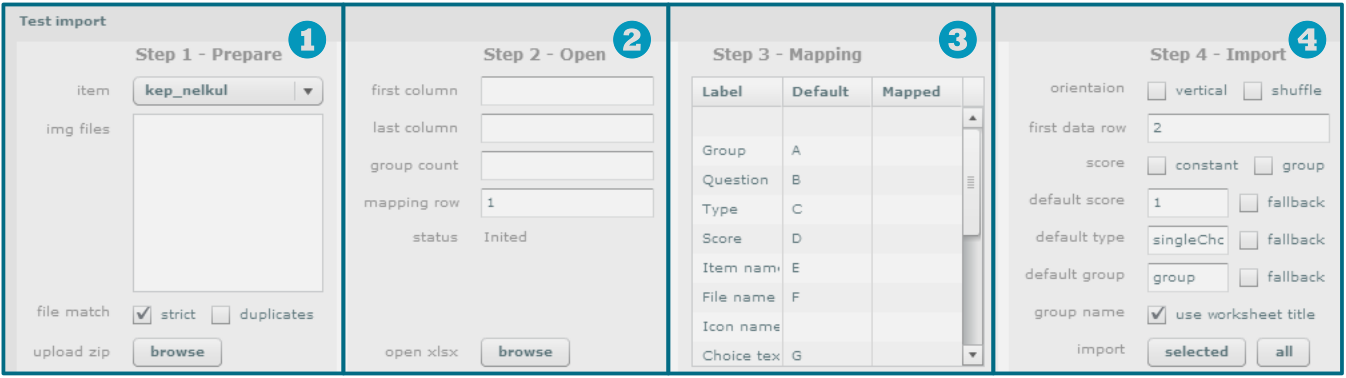 strict kipipálásával megadhatod, hogy az importáló hibát jelezzen, ha az Excel táblázatból hivatkozott képfájl nem található a zip fájlban. Ha a strict nincs kipipálva, akkor az importáló kihagyja a fájlt hibajelzés nélkül.A2:B4 tartomány az A oszlopban tartalmaz csoportneveket 4 sorban és a B oszlop tartalmaz kérdésszámokat ugyancsak 4 sorban. A szövegmezőbe kizárólag nagy betűket, számokat és kettőspontot lehet írni.Az importáló Office Open XML formátumú, azaz Excel 2007 és Excel 2010 xlsx fájlt tud csak beolvasni.