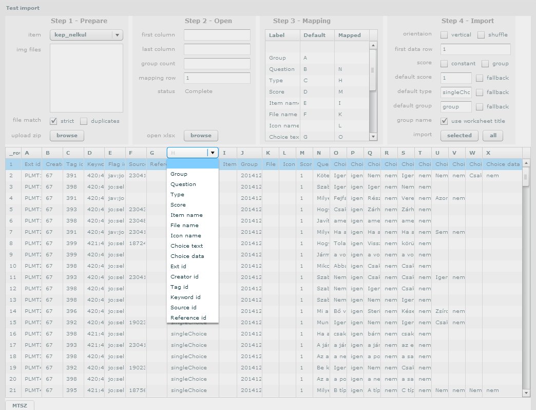 group count beállítást is, akkor ezt a mezőt biztosan át kell állítani.constant kipipálása esetén minden feladat egységesen megkapja a default score mezőbe megadott értéket a megfelelő oszlopból kiolvasott értéktől függetlenül.group jelölőnégyzet kiválasztása esetén az importáló beállítja kérdéscsoport pontszámként az adott csoportba importált feladatok közül a legmagasabb értéket. constant esetén ez az alapértelmezett érték lesz.fallback jelölőnégyzet kipiálása esetén azoknál a feladatoknál, ahol nem található a score oszlopban semmi, erre az értékre fog automatikusan beállni a pontszám. Ha nincs kipipálva és az importáló nem talál pontszámot az adott feladathoz, akkor hibát fog jelezni és megszakítja az importálást.default type: Alapértelmezett típus (ez most fixen: egyszeres feleletválasztás). A fallback jelölőnégyzet hasonlóan működik a pontszámhoz. Használatát csak abban az esetben javasoljuk, ha a táblázatban minden feladat egyszeres feleletválasztás és nincs típus oszlop megadva.