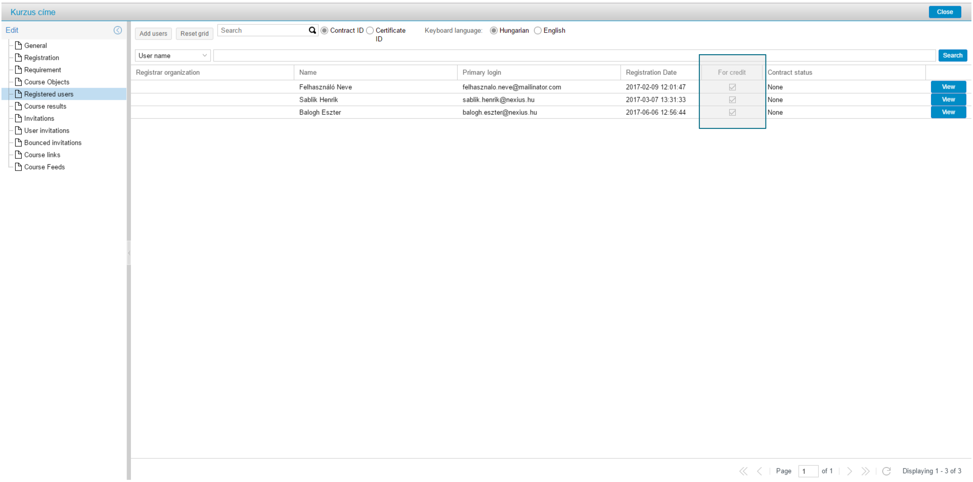 A tanuló a tanulói felületen nem látja, hogy hiteles vagy nem hiteles módban vesz részt a kurzuson. Az adminisztrátorok, terméktámogatók számára ez az információ az adminisztrátori felületen a Regisztrált felhasználók menüpontban listanézetben és részletes nézetben is elérhető, és a letölthető Kurzuseredmények riport is tartalmazza ezt az adatot.