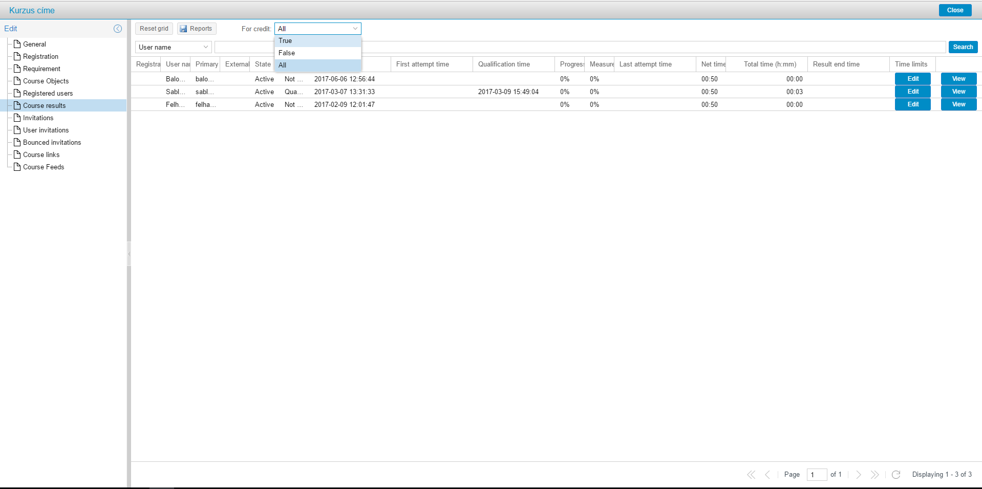 A Meghívók / Invitations menüpontban alapértelmezetten az összes, kurzushoz létrehozott sablon szerepel, de az adminisztrátori felületen a Hiteles mód / For credit szűrő segítségével megtekinthetők csak for credit: true vagy csak a for credit: false beállítású meghívók is.