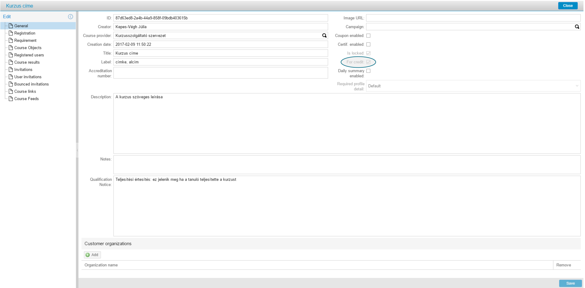 - Meghívóval történő beiratkozás esetén a meghívósablon alapértelmezetten a kurzus for credit értékével egyező beállítással jön létre, de létrehozáskor a kurzus