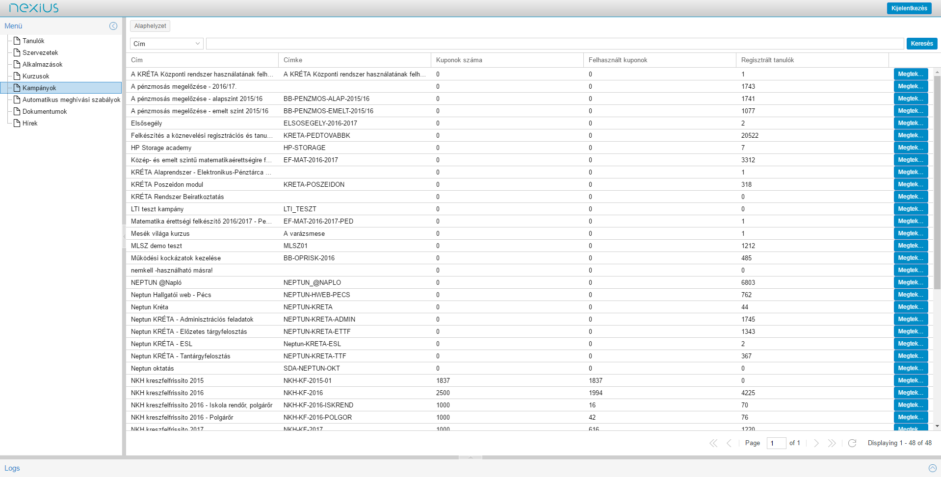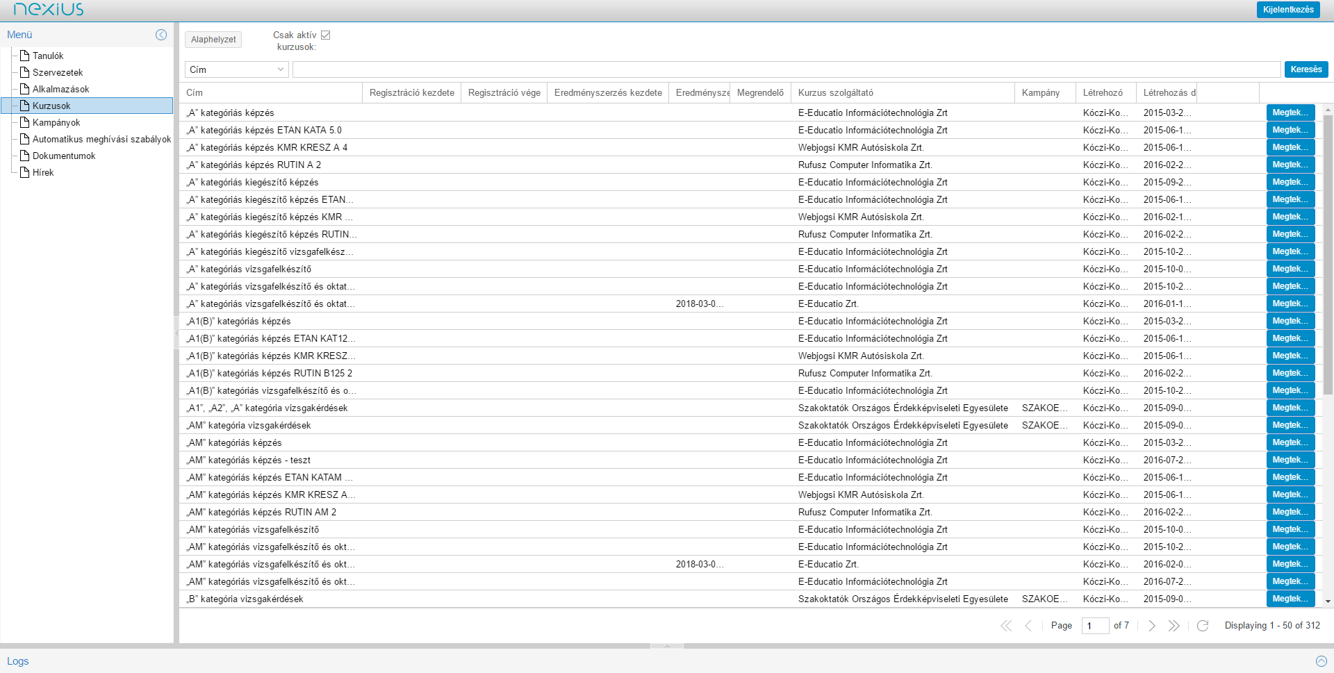 Az adminisztrációs felület bal oldalán található menüben a ’Kurzusok’ fül alatt található listából meg kell nyitni a keresett kurzust.