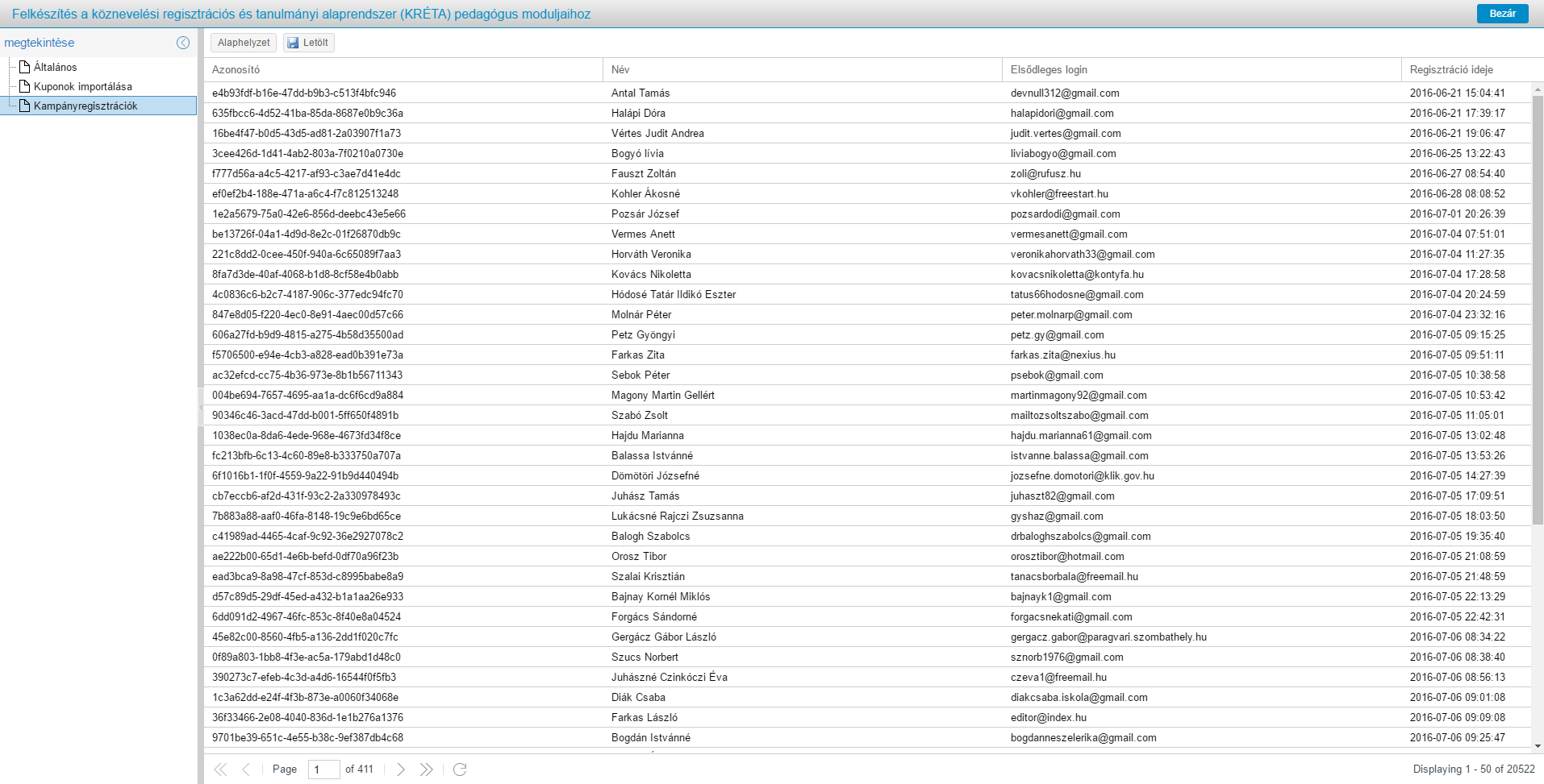 Kampányregisztrációs riport letöltése esetén, az adminisztrációs felület bal oldali menüjének ’Kampányok’ fülére kattintva, a szükséges kurzushoz tartozó kampány kiválasztása után a bal oldali ’Kampányregisztrációk’ fülön belül található, lemez ikonnal jelzett ’Letölt’ gombra kell kattintani.