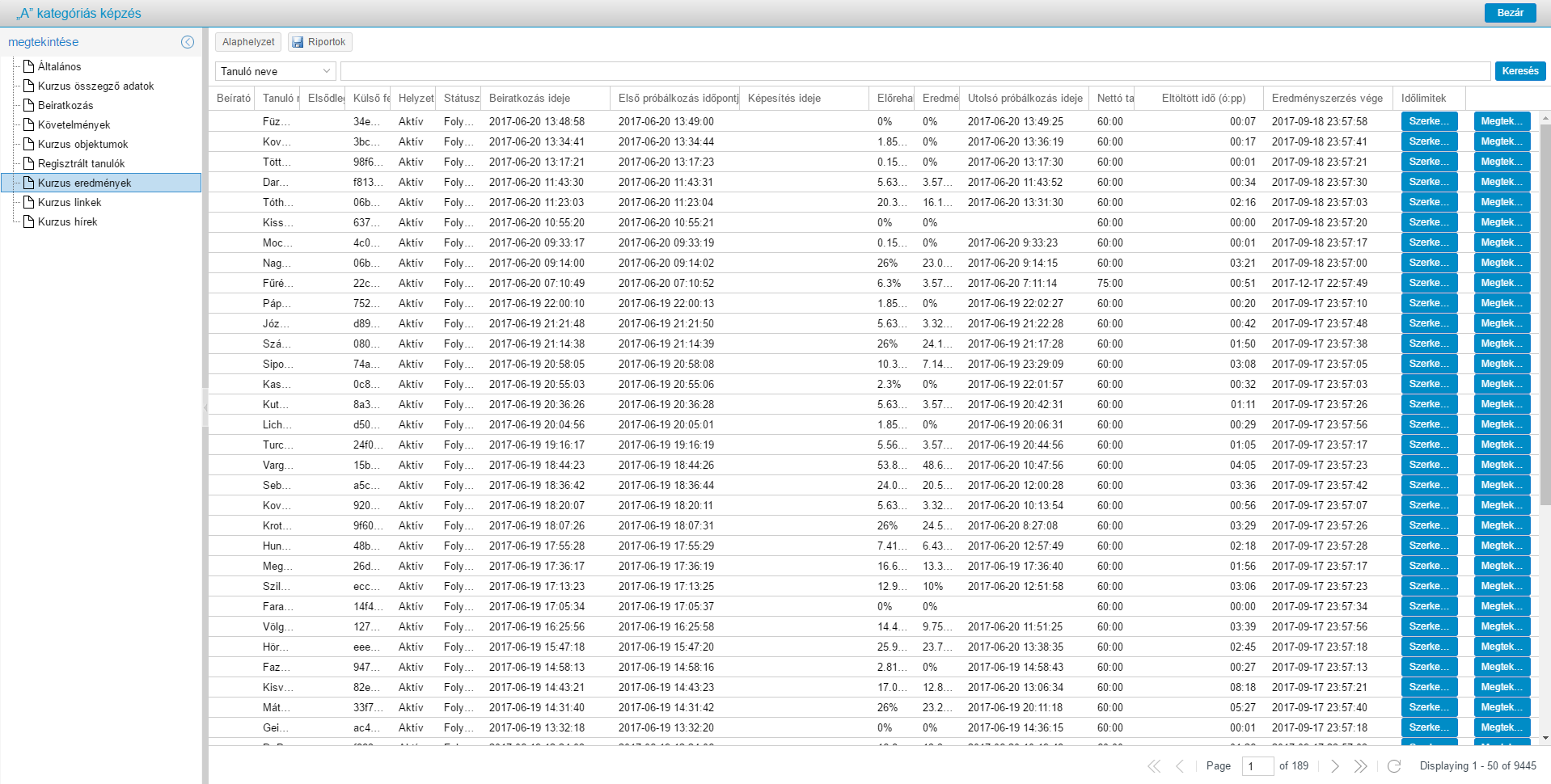 - A kurzuson belül a bal oldali menü ’Kurzus eredmények’/’Kurzus összegző adatok’ menüpontjának kiválasztása után, a keresési mező vagy fejléc feletti, lemez ikonnal jelzett ’Riportok’ gombra kell kattintani.