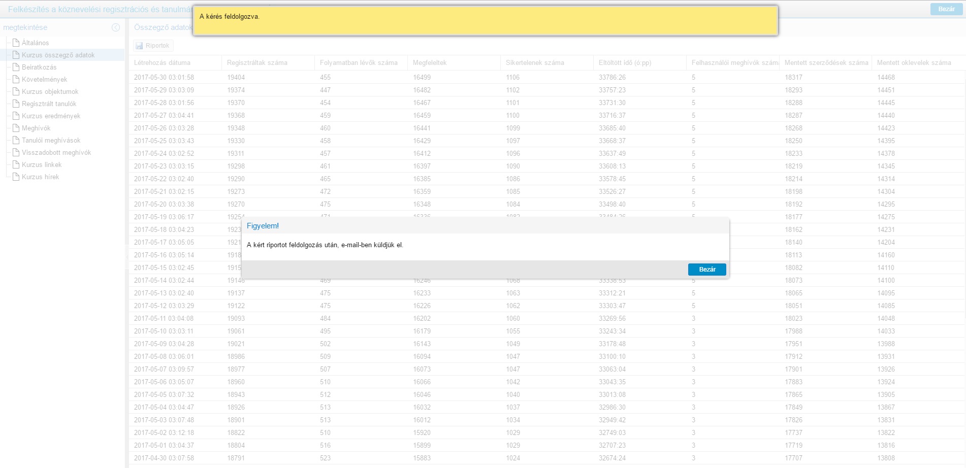 Letöltést követően rendszerüzenet tájékoztatja a felhasználót, hogy a kért riportot e-mailben kapja meg.