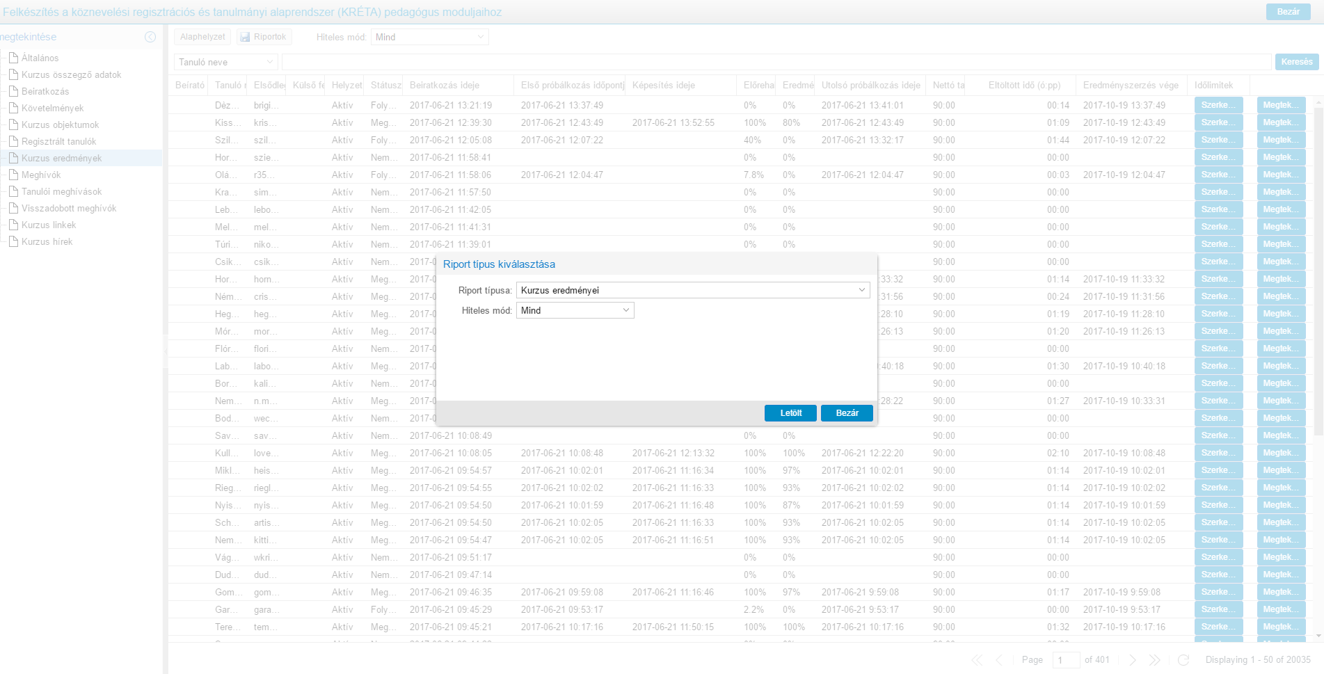 kampányregisztrációs riportot kivéve, az ezután felugró ablakban két riporttípus közül kell a felhasználónak választania: ’Kurzus eredményei’ vagy ’Kurzus eredményei meghívásokkal’/’Kurzus összesítő’ vagy ’Kurzus összesítő szervezeti bontásban’.