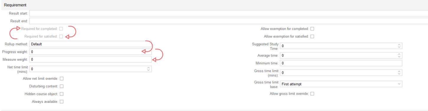 Ahhoz, hogy egy tananyag ne számítson bele a tanuló eredményszerzésébe (legyen opcionális), a kurzus Kurzus objektumok/ Course object menüpontjában a tananyag részletes nézetét megnyitva az alábbi beállításokat kell módosítani: