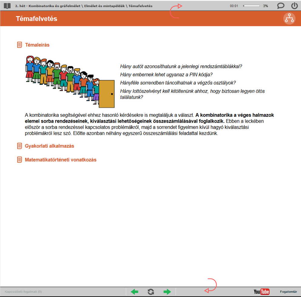 • könyv ikon, amelynek segítségével a tanuló megnyithatja a tananyag tartalomjegyzékét, ahol át tudja tekinteni a tartalmi egységeket, látja, hogy mely egységeket teljesítette már és mik vannak még hátra, valamint a tananyag egy kívánt tananyagoldalra tud navigálni,