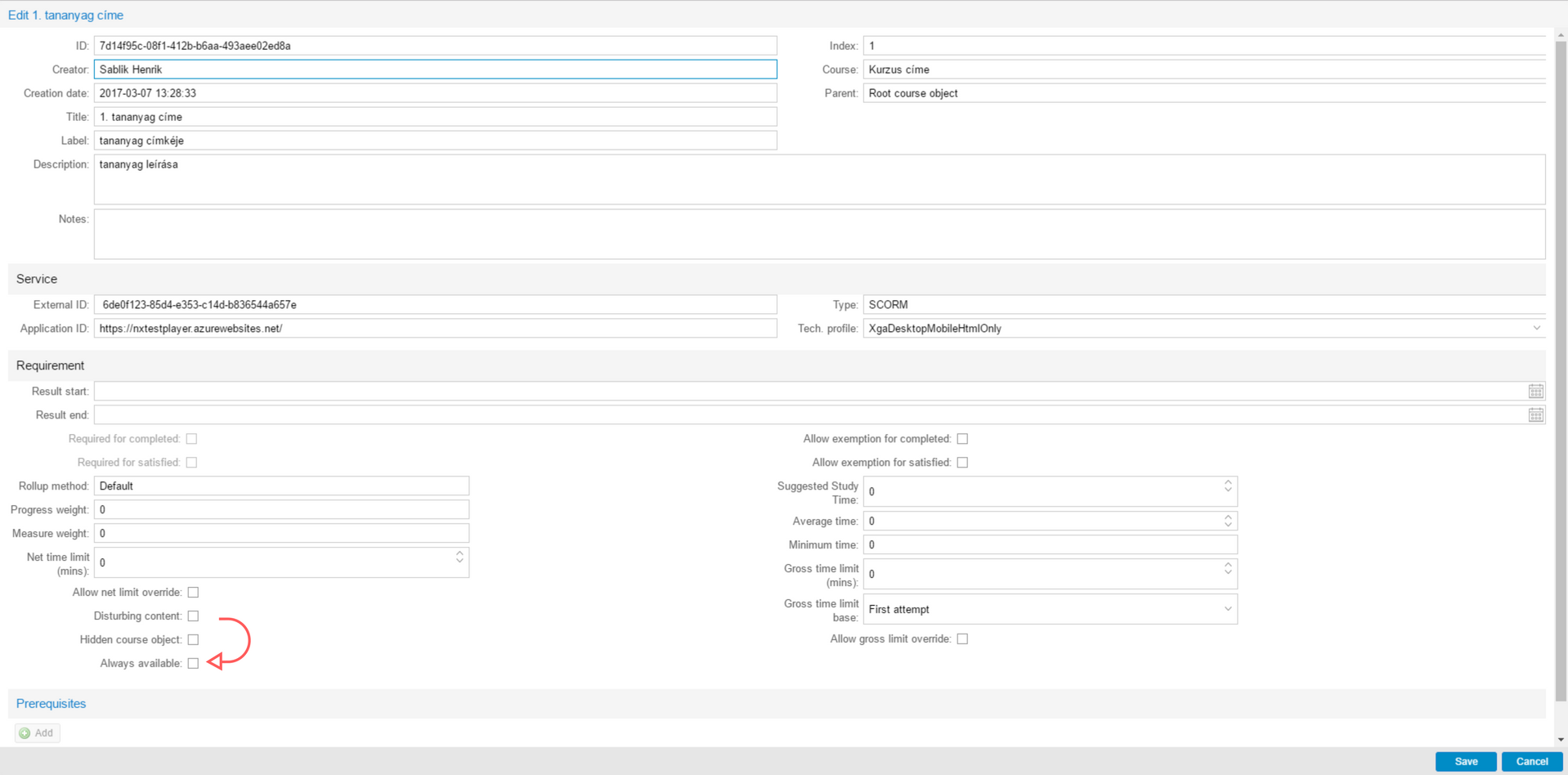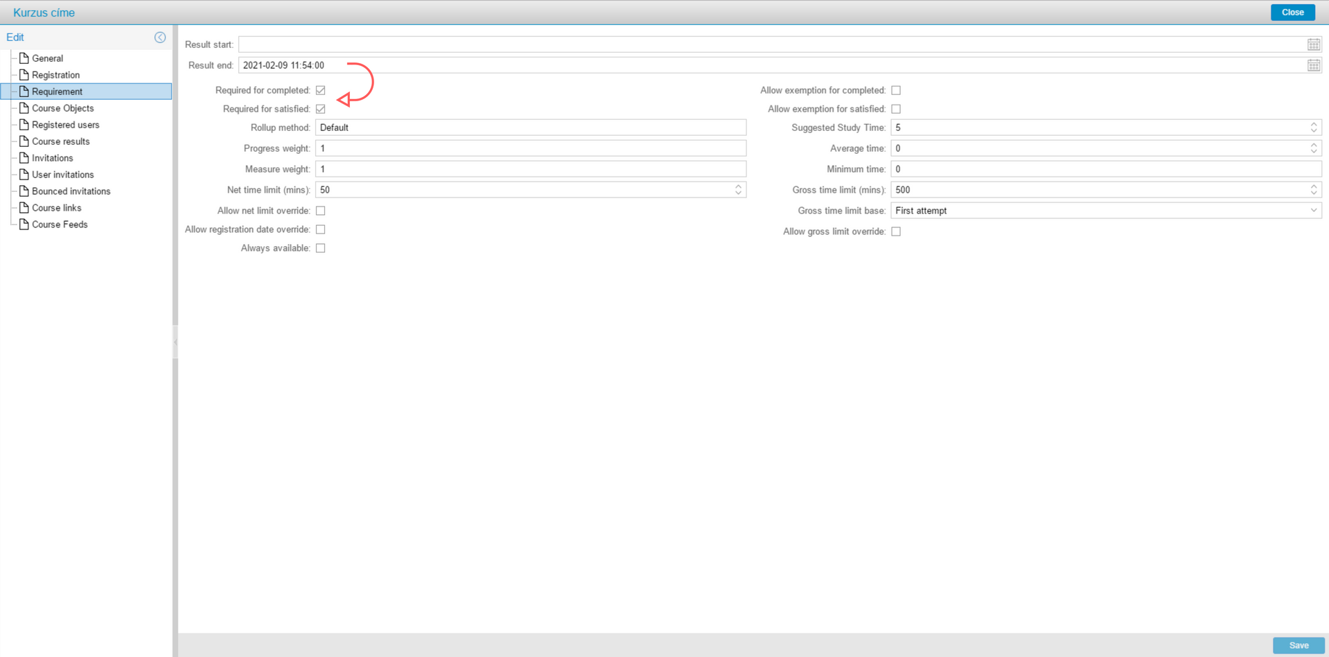 A kurzus teljesítéséhez szükséges minimum tanulási időt az adminisztrátori felületen a Követelmények / Requirements fülön lehet megadni, és megadható, hogy tanulók kaphassanak-e felmentést a kurzus befejezése vagy eredményessége alól.