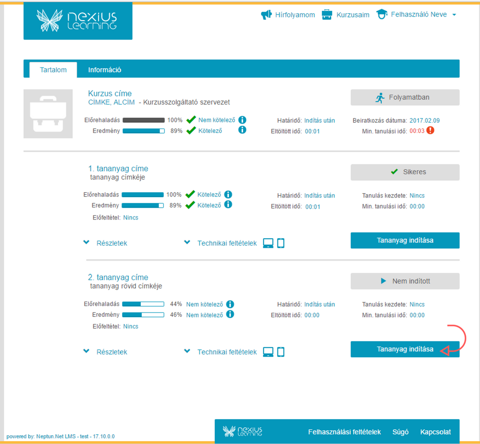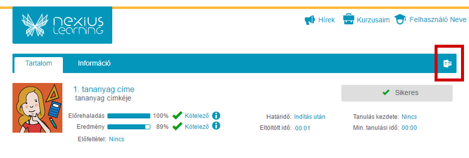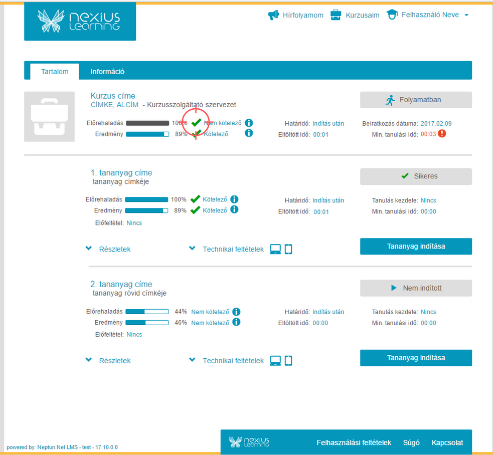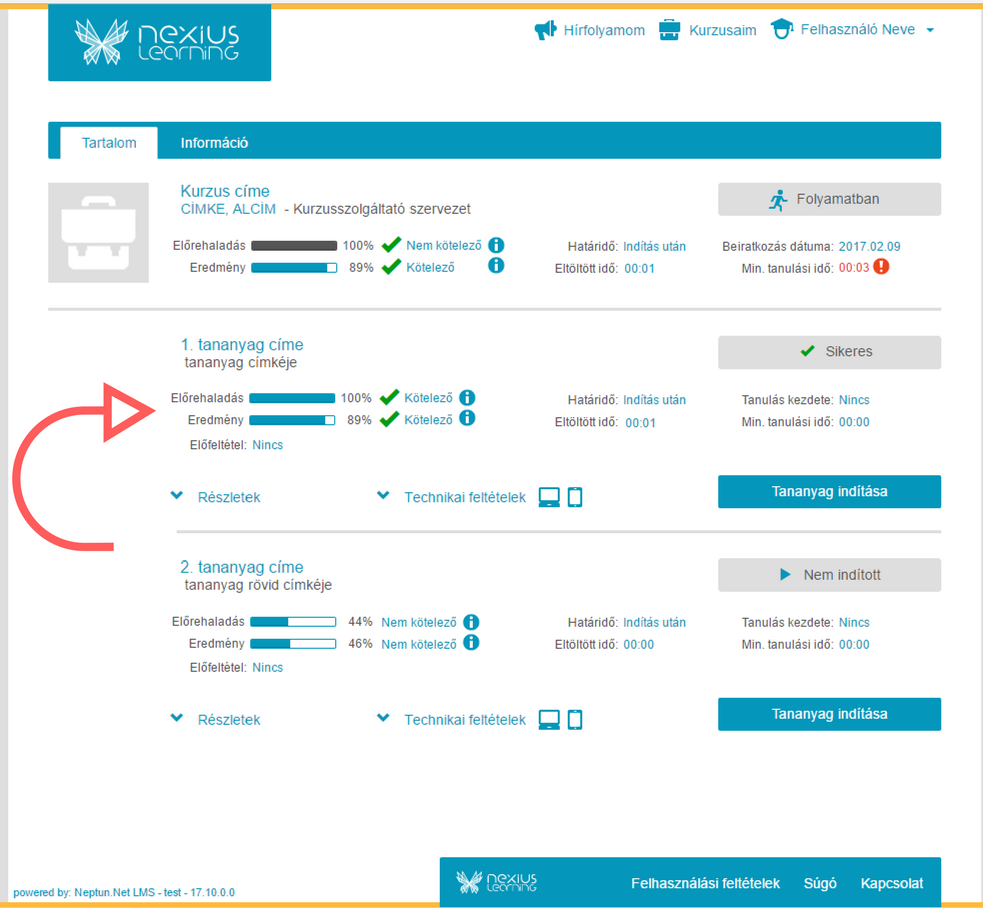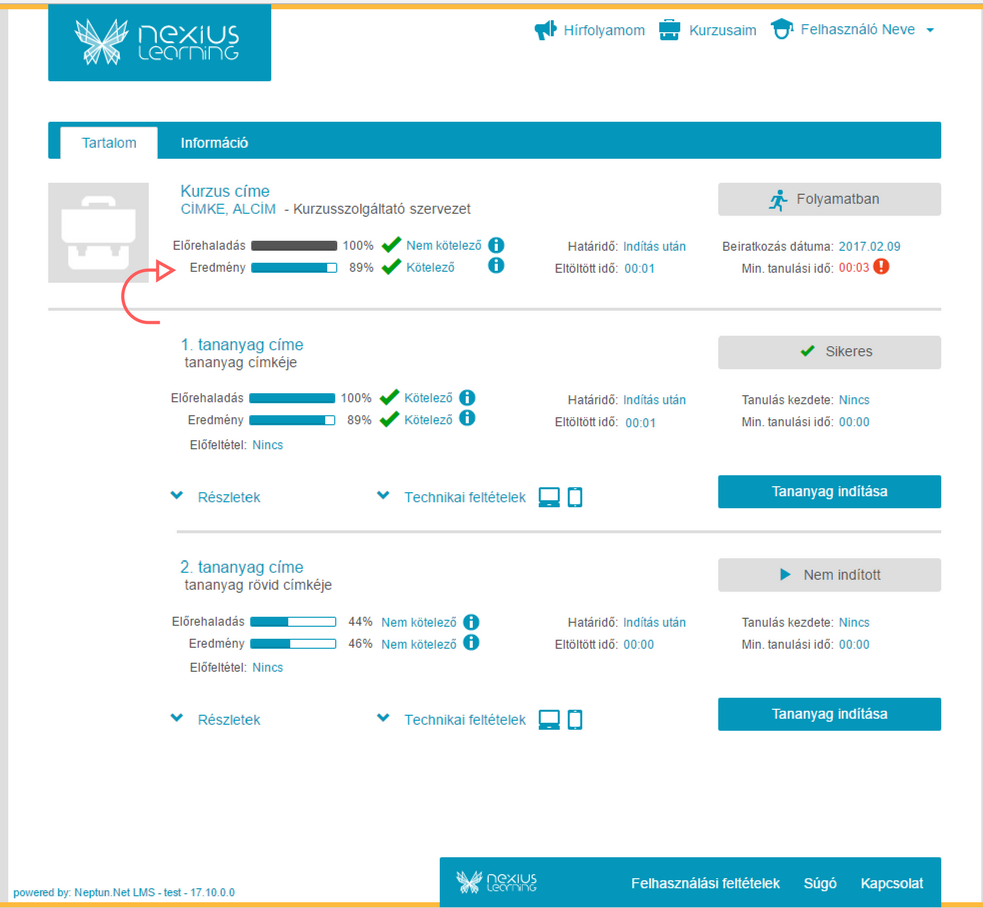 Előrehaladás / Progressés azEredmény / Resultmellett megjelent a zöld pipa, és amin. tanulási idő / Min. study timenem piros (az eltöltött idő nem kevesebb mint a minimum study time), akkor a tananyag állapotaSikereslesz.