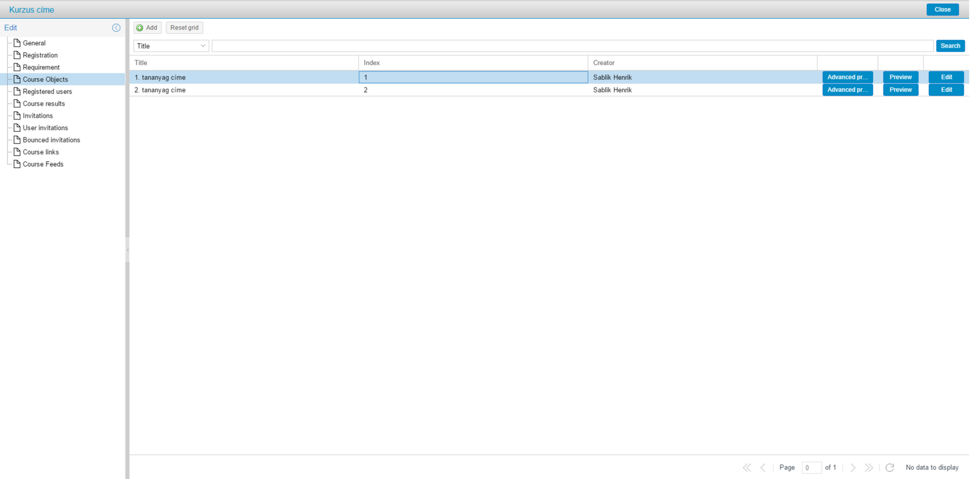 A tananyag adatait az adminisztrátori felületen az adott tananyagnak megfelelő kurzusobjektum beállításainál lehet megadni.