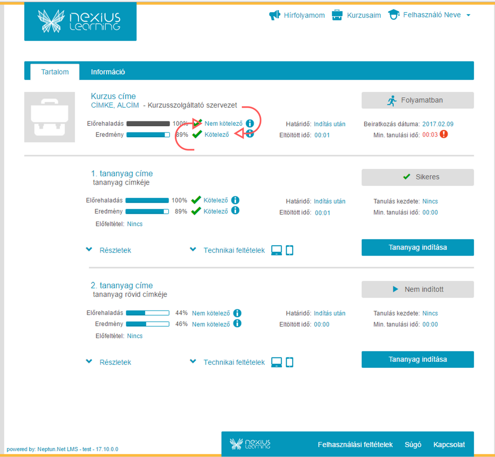 A kurzus megnyitásakor a kurzus követelményei és eredményei kiegészülnek a minimum tanulási idővel, és a rendszer a beiratkozás dátumát is feltünteti.