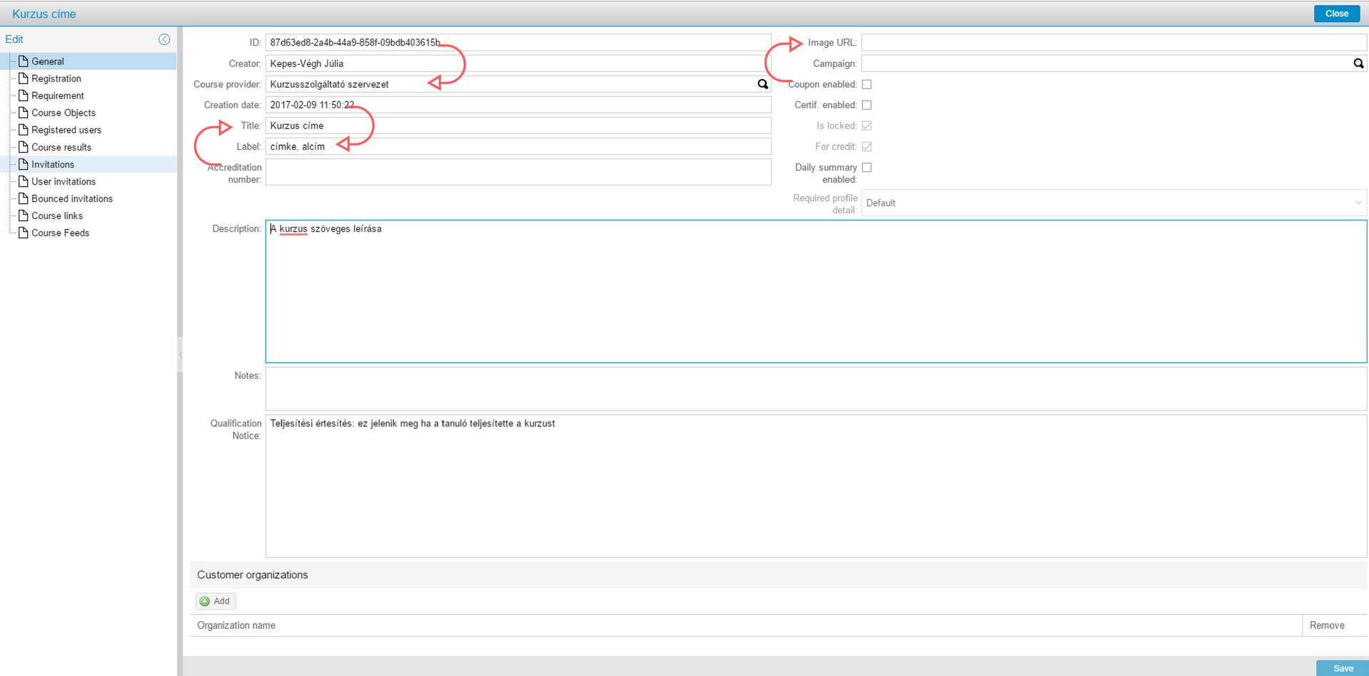 Ezeket az adatokat a kurzus létrehozásakor vagy a kurzus létrehozása után a kurzus Általános fülén lehet megadni.