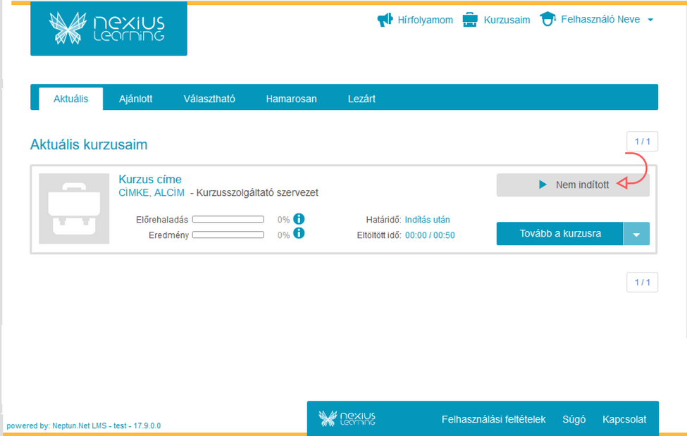 Nem indított / Not attempted, ha a tanuló az adott kurzus egyetlen tananyagát sem indította el,Meghívás / Request, ha a tanuló meghívás útján vált jogosulttá a kurzusra (ebben az esetben a kurzus azAjánlottkurzusfülön található),Választható / Optional, ha a kurzus aVálaszthatófülön található, mert a tanuló kampányon keresztül került kapcsolatba a kurzussal,Nem indítható / Unavailable, ha a tanuló már beiratkozott, de még nem tudja megkezdeni a tanulást (ebben az esetben a kurzus aHamarosankurzusfülön található),Folyamatban / In progress, ha már megkezdte a tanulást, vagyis a kurzus valamely tananyagát már megnyitotta, de még nem teljesítette a kurzus összes követelményétSikeres / Successful, ha sikeresen teljesítette a kurzus minden követelményét,Sikertelen / Failed, ha a tanuló a megadott határidőn belül nem teljesítette a teljesítései feltételeket.