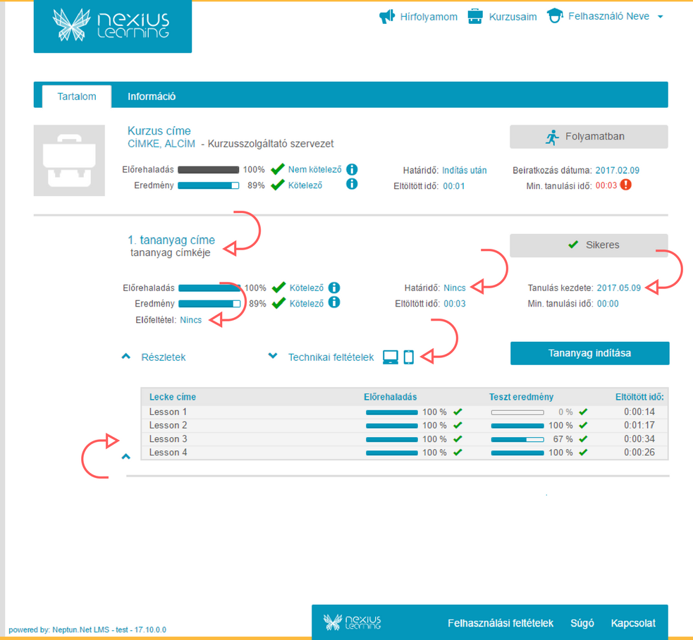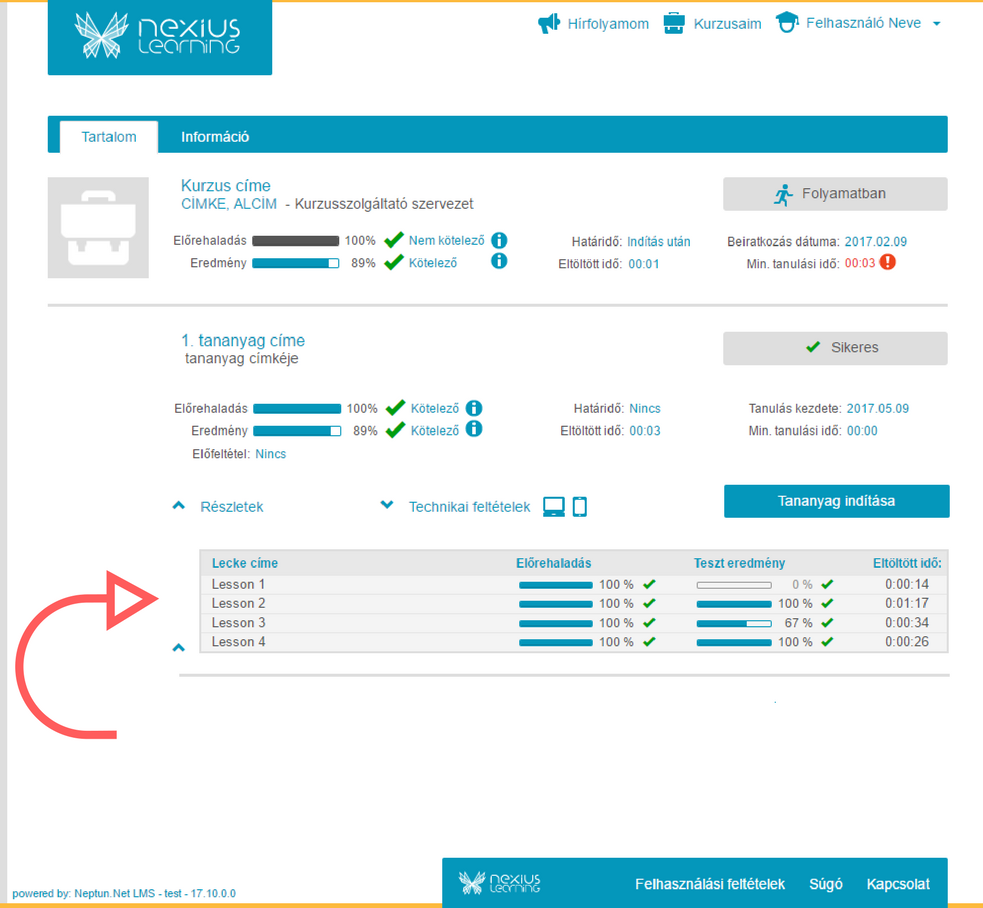 A kurzus alatt felsorolt tananyagoknál a kurzussal megegyező módon vannak feltüntetve a tanuló tananyagban elért eredményei: